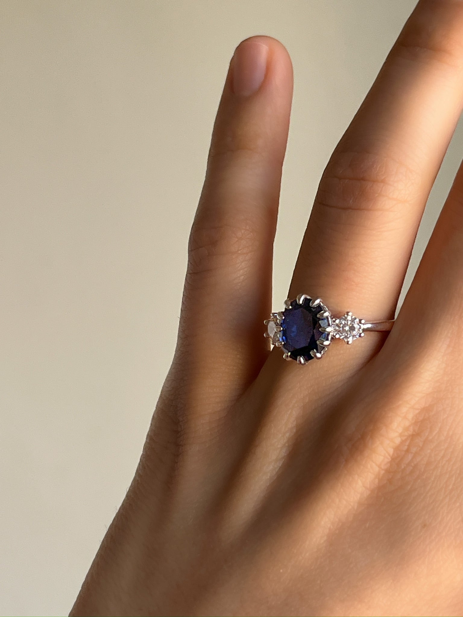 ANILLO PLATA.925 ZIRCO OVALADA GARRA+ZIRCO CIRCULAR BLANCA EN CADA LADO.