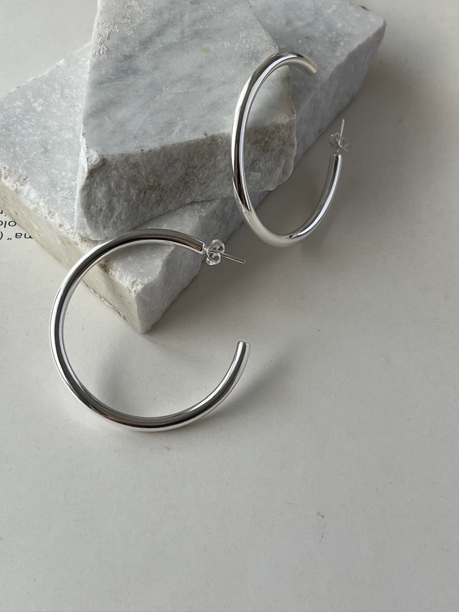 Arracadas Abiertas Lisas Plata .925 (5.2cm x 3.5mm). Inspiradas en el movimiento y expansión del universo. Su diseño abierto y liso aporta un estilo atemporal pero con fuerza cósmica.
