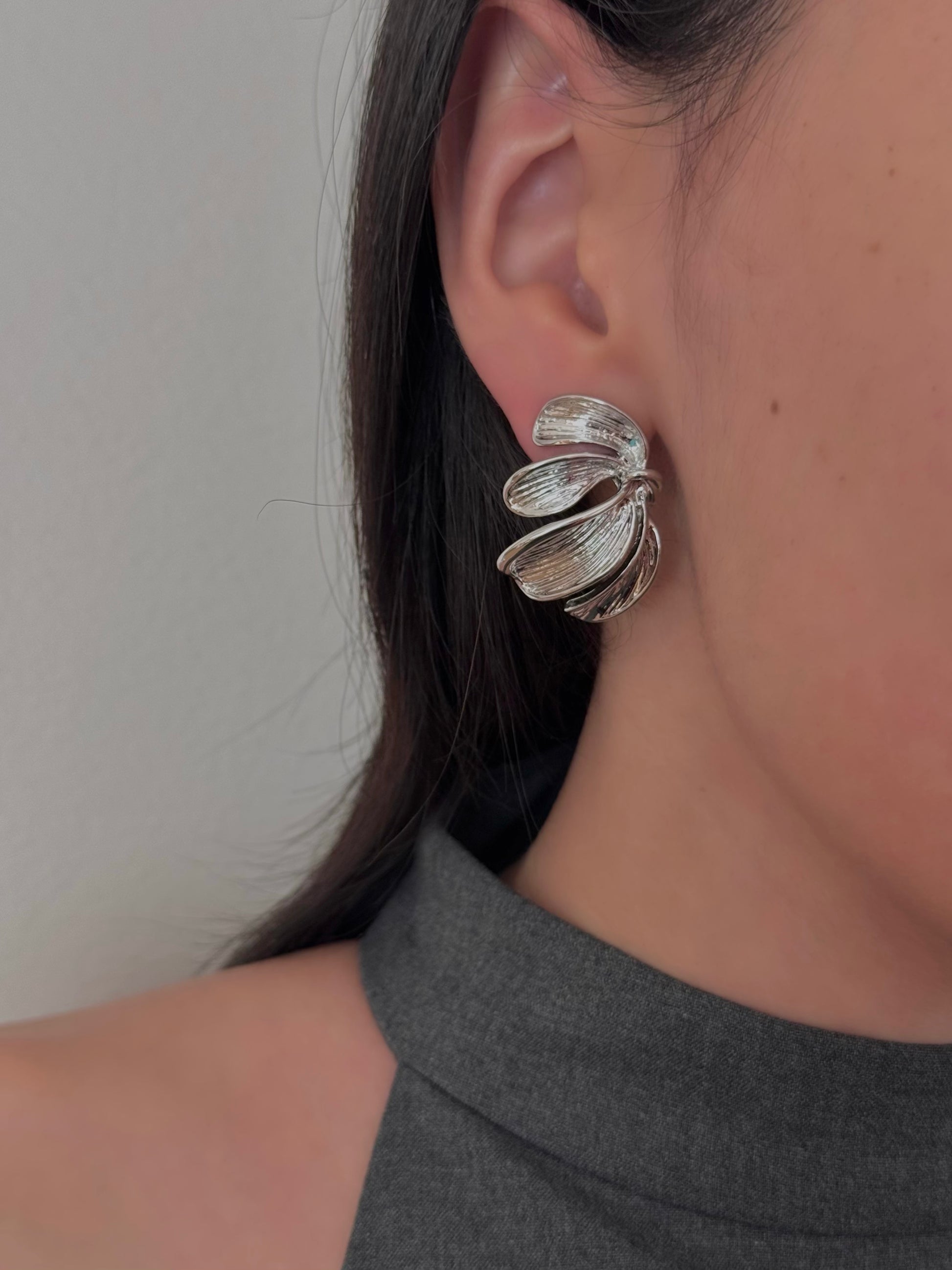 Aretes 4 Pétalos Rayados Lado Único Plateados