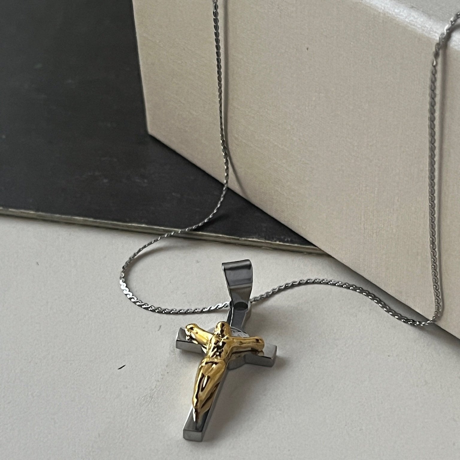 Cristo Olímpico de acero inoxidable amarillo con cruz plateada de 50 cm, combinación de tradición y modernidad.