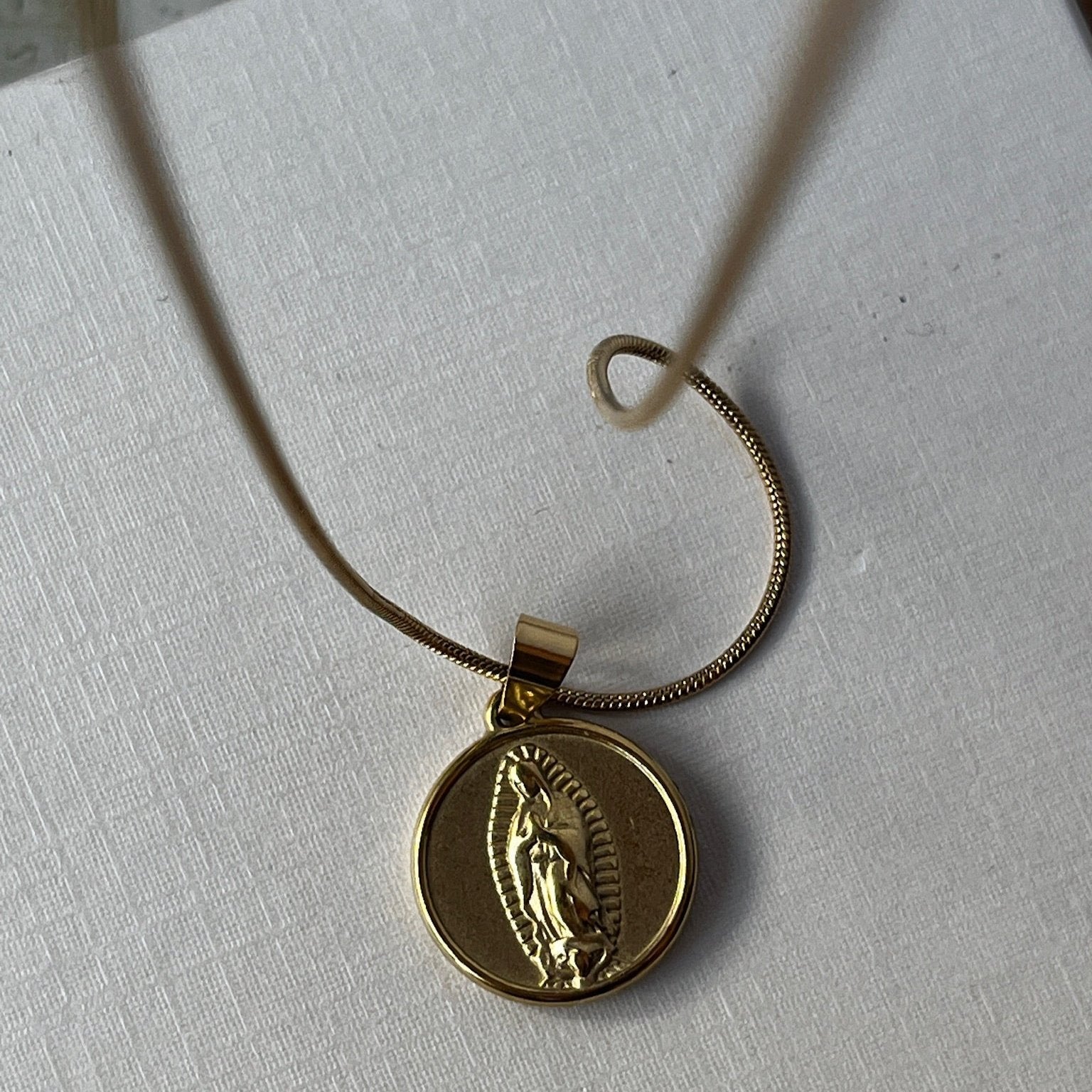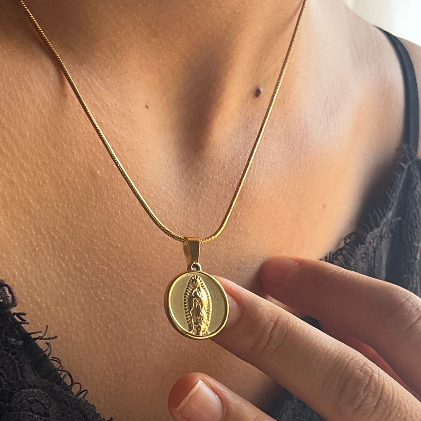 Collar con medalla de la Virgen de Guadalupe en acero inoxidable amarillo, símbolo de fe y estilo.