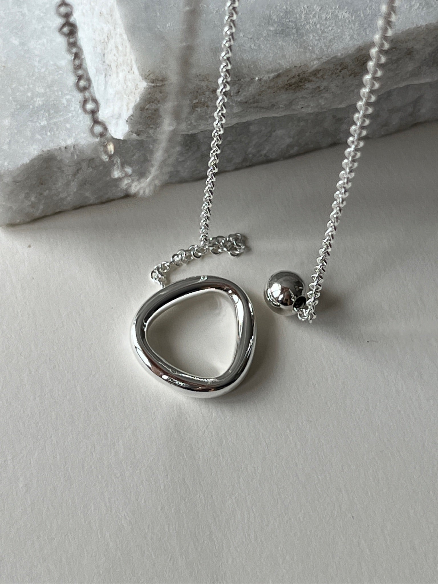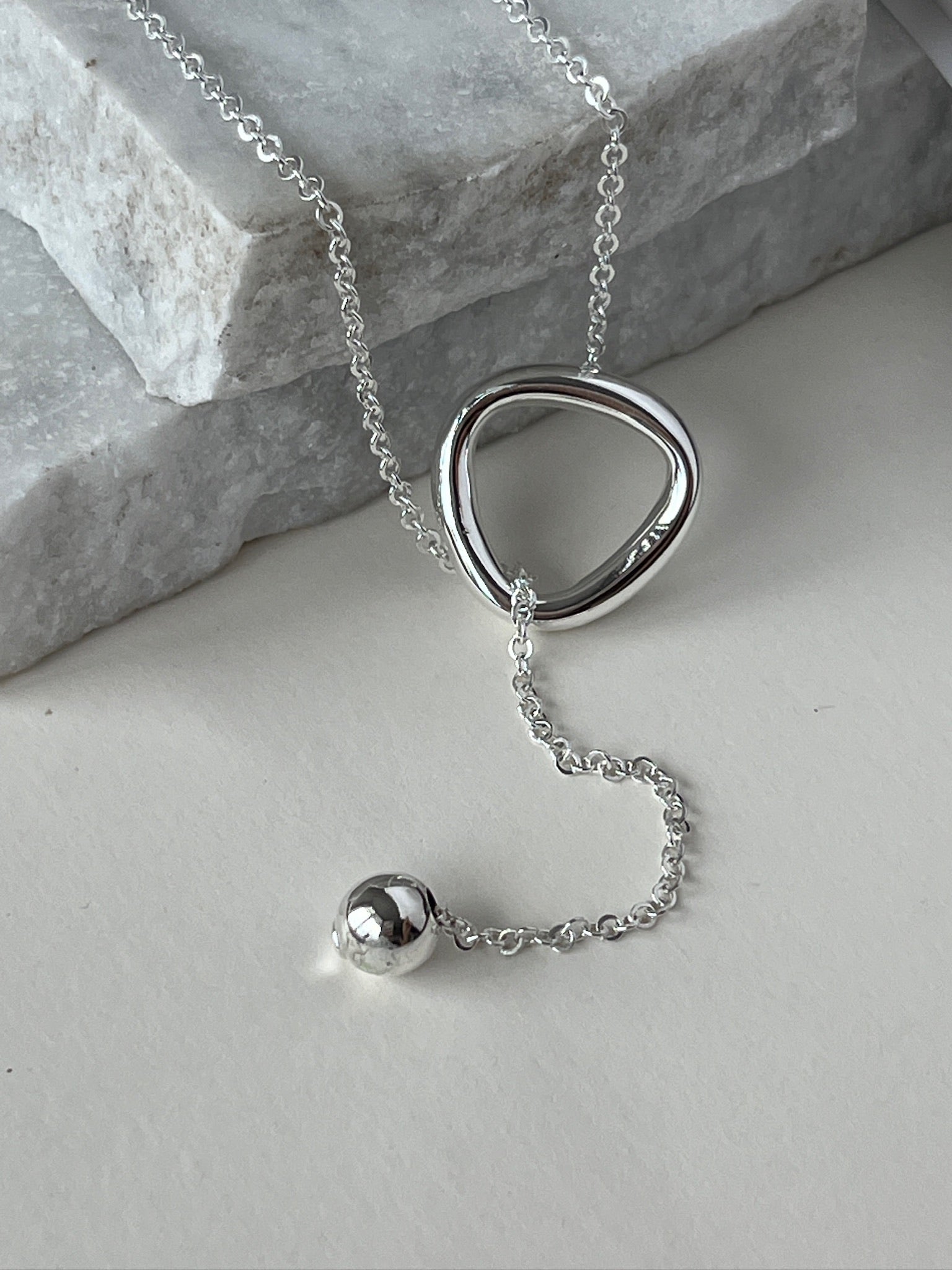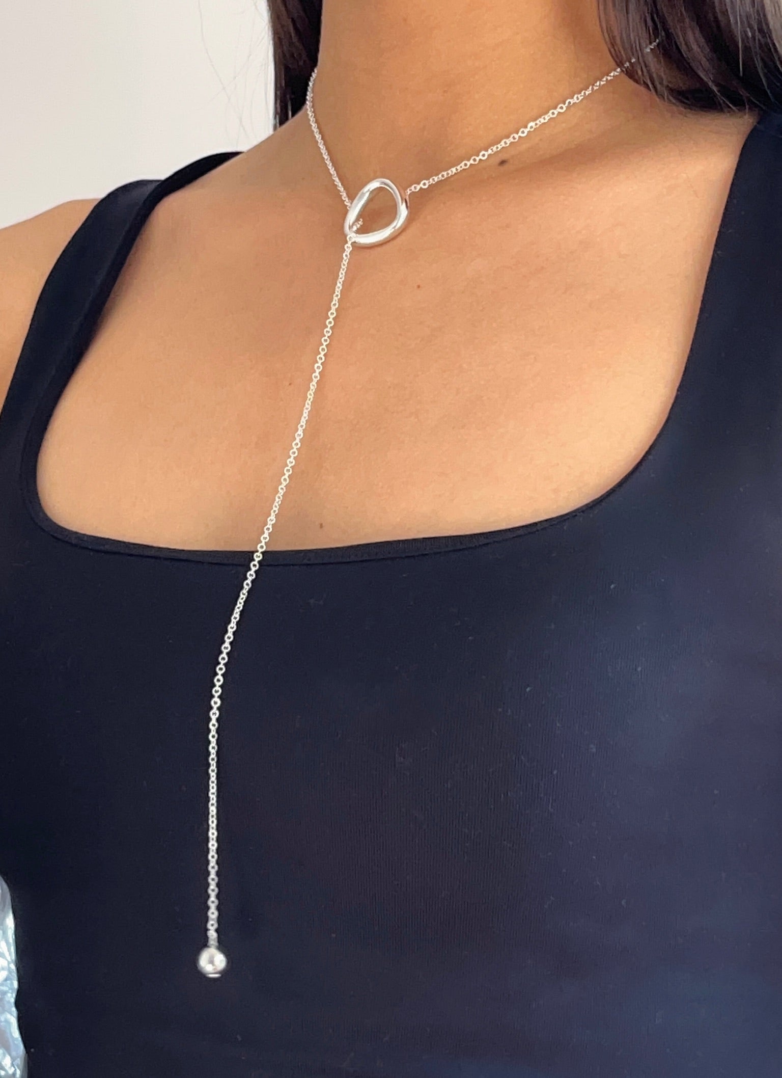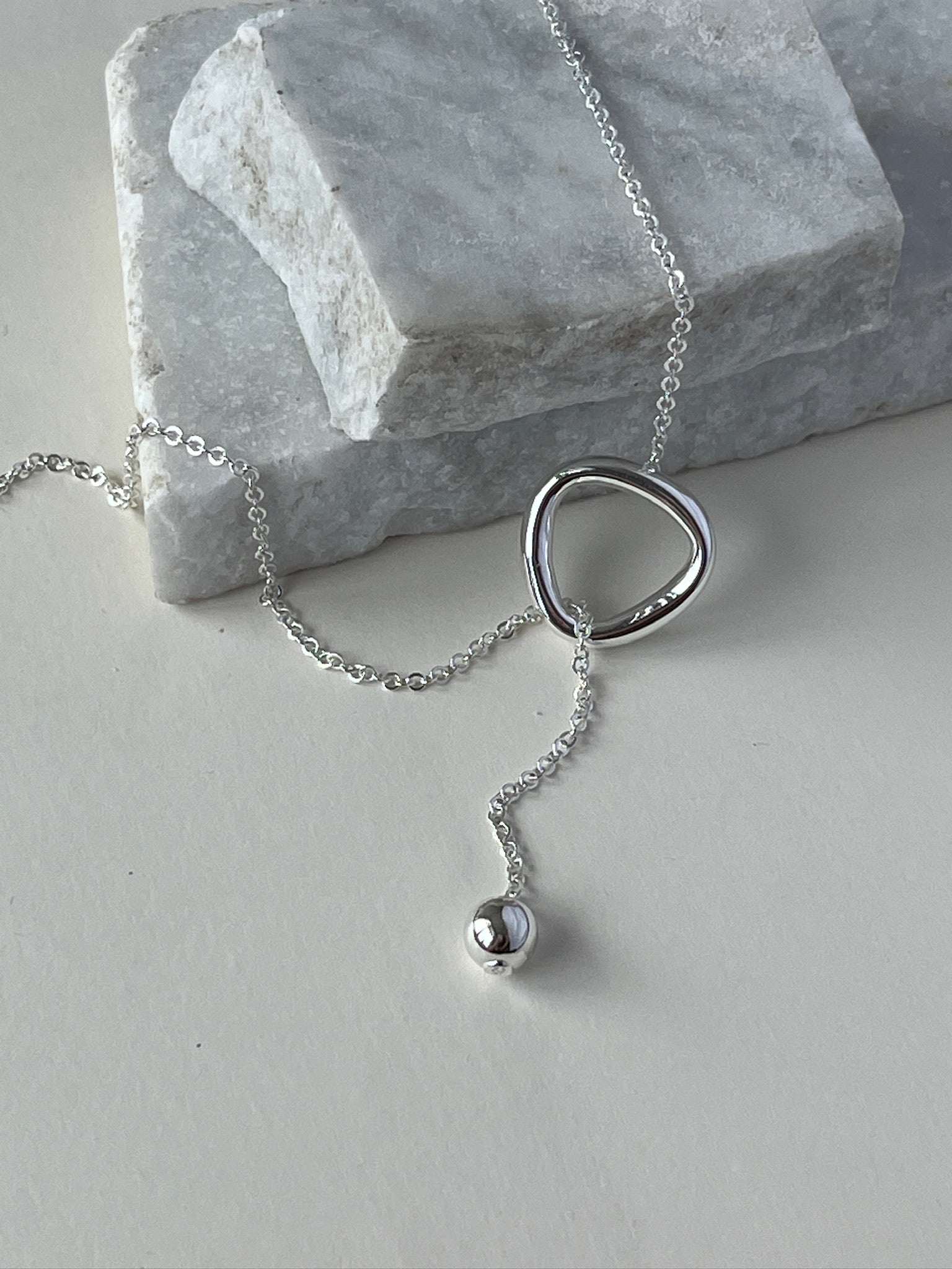 Dije de plata .925,un triángulo hueco liso acompañado de un diseño tipo corbatero con una bola lisa que aporta movimiento y estilo. Su cadena larga de 60 cm lo convierte en un accesorio llamativo, ideal para lucir sobre blusas o vestidos.