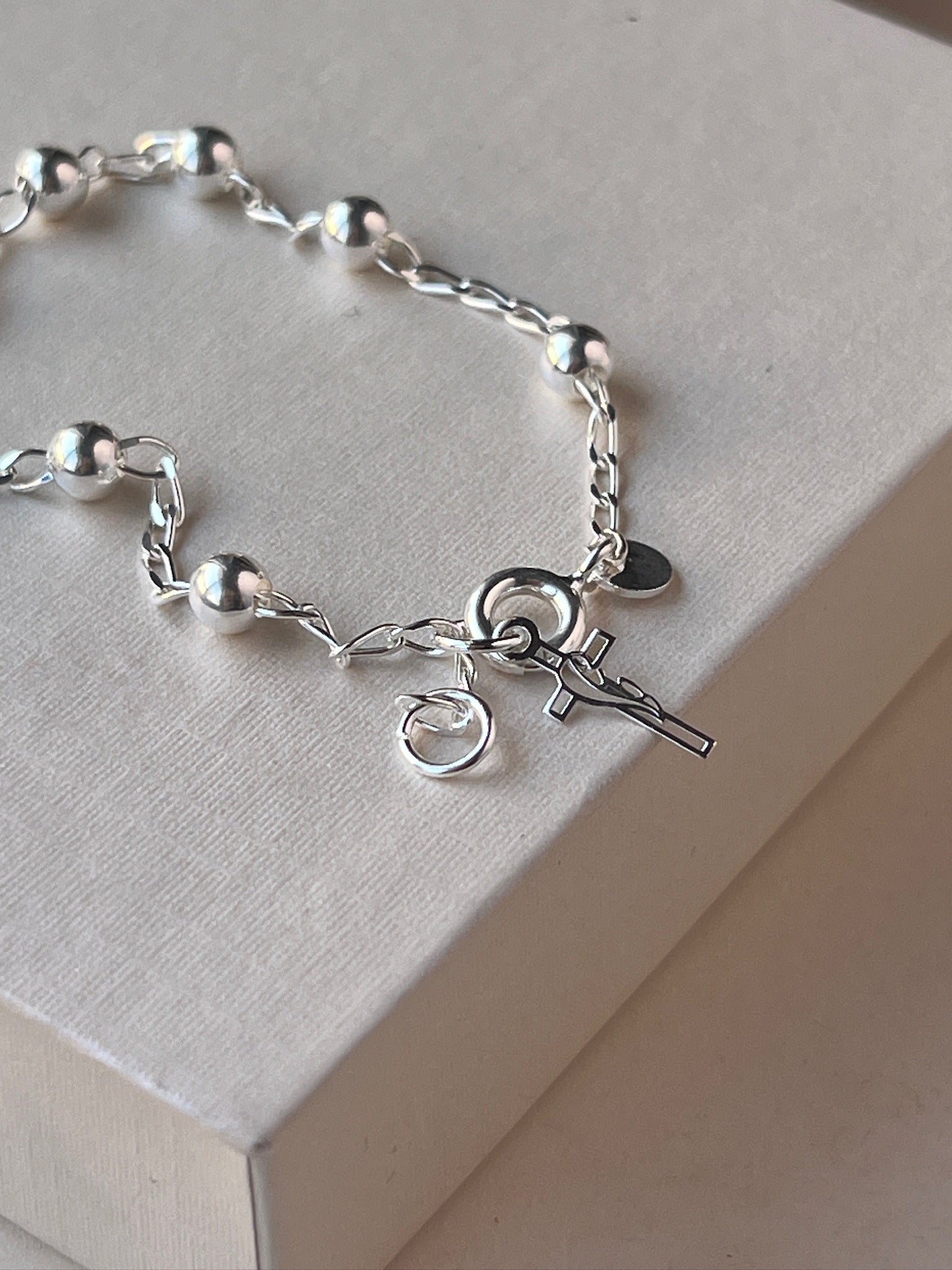 ROSARIO PLATA.925 BOLAS LISAS+CRUZ VIRGEN MARADONA 18.5CM LARGO